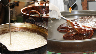 砂糖や水あめを原料とし、溶解し、高温に煮詰めることでコクが生まれます。様々な原料を熟練した職人が飴を練り込んで行きます。