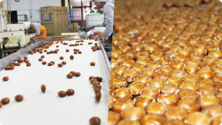 成型後、再度飴を冷却します。最後は人の手によって検品し、包装機で個包装を行い、金属探知を通過し、袋詰めをされ商品となります。